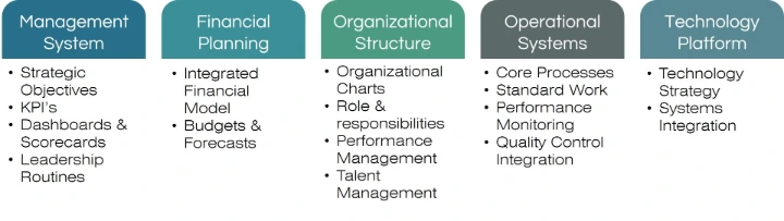 The first pillar focuses on establishing strategic control. A high-performance business requires clear leadership routines and data-driven dashboards that allow for a "single source of truth".